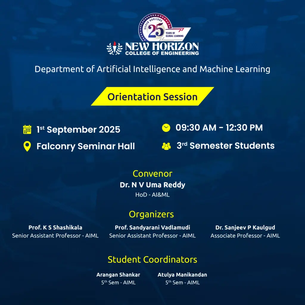 CO-CURRICULAR ACTIVITIES Orientation Session for III Semester Students Date: 02/09/2025 Time: 09:30 AM to 12:30 PM The Department of Artificial Intelligence and Machine Learning at New Horizon College of Engineering conducted an Orientation Session for III Semester students on 2nd September 2025, from 09:30 AM to 12:30 PM at Falconry Seminar Hall. The event welcomed […]