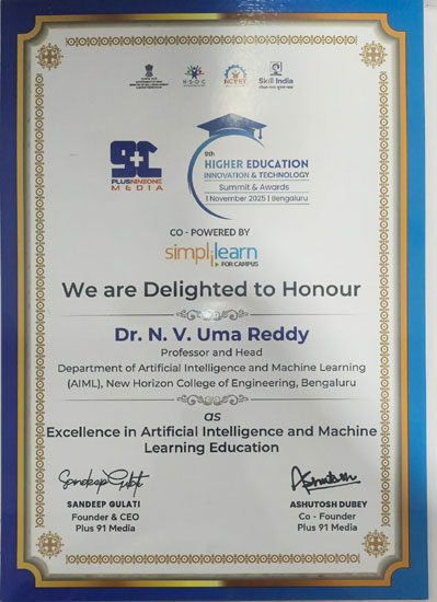 The Department of AIML proudly congratulates Dr. N. V. Uma Reddy, Professor and Head, for being honoured with the Excellence in Artificial Intelligence and Machine Learning Education Award at the 9th Higher Education Innovation & Technology Summit and Awards, held in Bengaluru on 1st November 2025. This prestigious recognition celebrates her outstanding leadership, pioneering initiatives, and unwavering commitment to elevating AI and ML education. Dr. Uma Reddy’s visionary contributions have consistently inspired both faculty and students, strengthened the department’s academic excellence, and enhanced its reputation in emerging technologies. Her dedication continues to shape the next generation of innovators and brings immense pride to the department.